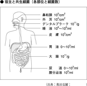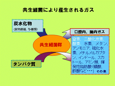 1.は、我々のからだのありとあらゆる部位に細菌、ウイルスが共生(share)しているのです。皮膚表面、陰部、口腔を入口とする消化管、特に大腸内が最大の細菌密度を持ち、500から1000種類、その数100兆個以上といわれています(下の2枚の図)。これらはそれぞれに内在酵素をもち、栄養素:炭水化物、タンパク質を基質にさまざまな化学成分を生産しています。それらのうち、分子量が小さい揮発性成分が、ガス、におい成分ということになります。 |