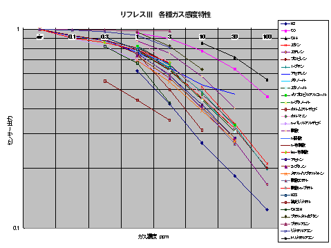 | リフレスは、下図に示すように生体試料(口腔ガス、呼気ガスなど)のあらゆる微量ガス成分(窒素、酸素、炭酸ガス、水分を除く)に感度を持っています。これは、「においのある」成分も、「においの無い」成分も区別なくです。これが、リフレスの最大の特徴です。 (リフレスは、全ての、いわゆる可燃性ガスに感度を持っています) |